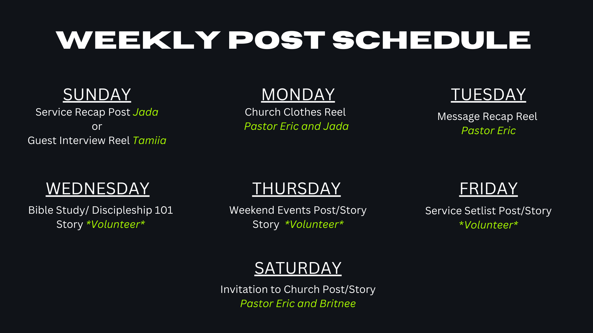 Luckily he already had a very consistent brand design, it just need to be implemented with a better strategy. We decided to create a posting schedule and assign roles.